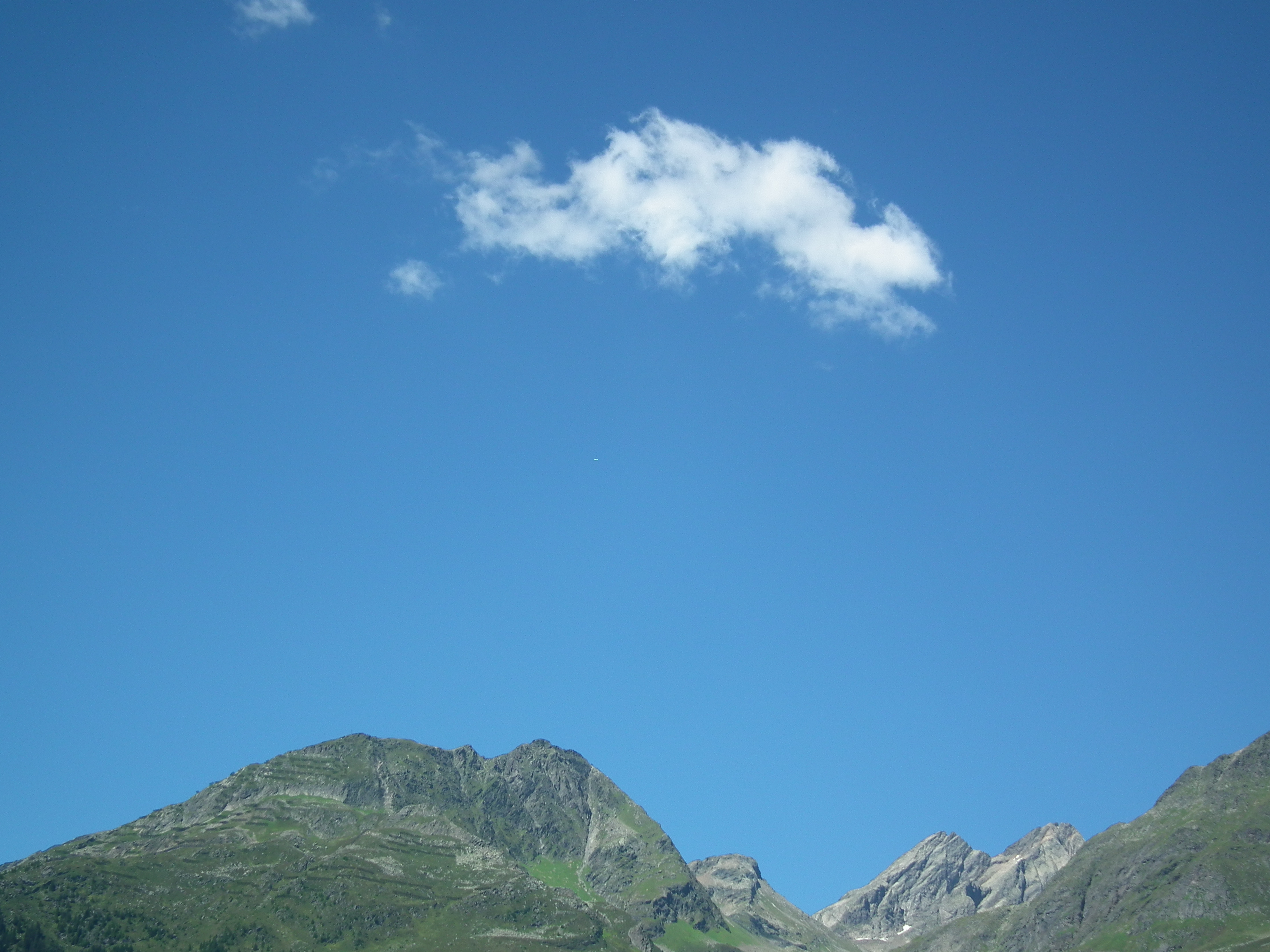 (Suchbild, mit vergrößrn sieht man das Flugzeug halbe Strecke zwischen Gipfel und Wolke)